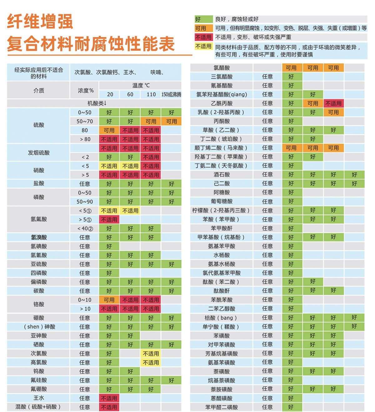 經過實驗和生產中的實際應用,高性能復合材料真空泵可以很好的適用于抽吸氯化氫、磷酸、鹽酸、甲苯、乙醇、二氧化硫、二氯甲烷、二氯乙烷、溴化氫等多種酸性腐蝕氣體和有機溶劑(詳見纖維復合材料耐腐蝕性能表)。